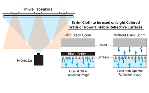 In general, any perforated screen will let a lot of light through the screen and if the surface behind the screen reflects this light, this can lead to diminished contrast. Painting such surfaces dark is not always an option so a black scrim is included with every screen. Not only will it help with contrast, but it is acoustically transparent so it will not hinder audio performance if placed over speakers.